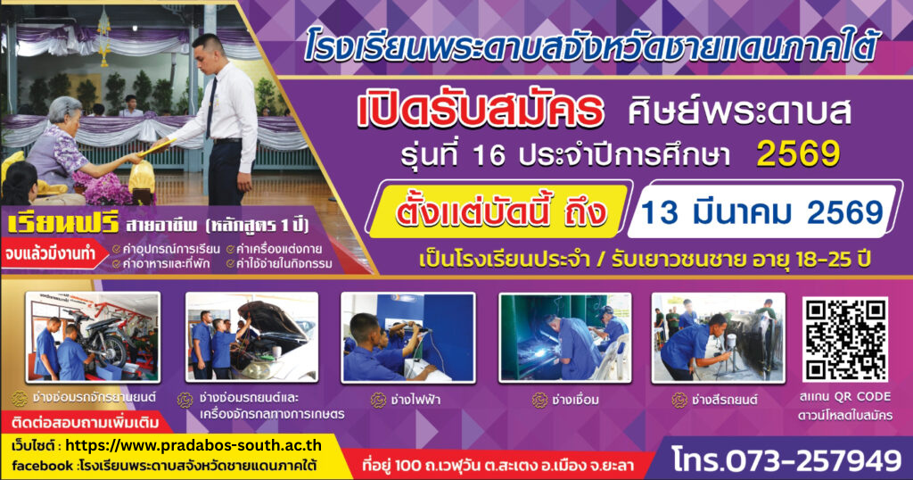 วันที่ 12 ตุลาคม 2568 โรงเรียนพระดาบสจังหวัดชายแดนภาคใต้ ร่วมเป็นเจ้าภาพทอดกฐินสามัคคี ณ วัดสารพฤกษา… Read more: ร่วมเป็นเจ้าภาพทอดกฐินสามัคคี ณ วัดสารพฤกษาวาส (วัดไม้แก่น) - การจัดอมรมให้ความรู้และเพิ่มทักษะการขับขี่รถจักรยานยนต์และ รถยนต์